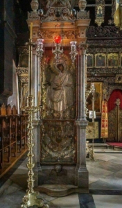 Η θαυματουργός εικόνα της Παναγίας της «Γερόντισσας» βρίσκεται στην Ιερά Μονή Παντοκράτορος του Αγίου Όρους και είναι εφέστια εικόνα του Μοναστηρίου. Είναι αντίγραφο της ψηφιδωτής εικόνος της Παναγίας Γοργοεπηκόου, που βρισκόταν Παντοκράτορος στη μονή της Κωνσταντινουπόλεως. Η μορφή της είναι στη θέα γλυκύτατη, ευχάριστη και γεμάτη έλεος, αφήνοντας στον κάθε προσκυνητή αισθήματα χαράς, ευφροσύνης, αγαλλιάσεως, ελπίδας, παρηγοριάς ευσπλαχνίας, δείχνοντας ότι προστρέχει στην ανάγκη των τέκνων της και ότι πάντοτε παραμυθεί τους πιστούς της.