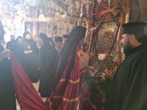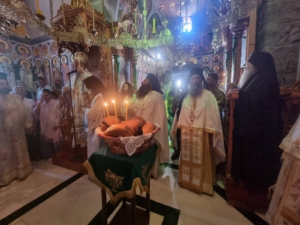 Το εσπέρας της Τετάρτης 9 Ιουλίου, τελέστηκε στο Καθολικό της Μονής ο Μέγας Πανηγυρικός Αρχιερατικός Εσπερινός. Με την πατρική προτροπή και ευλογία του Σεβασμιωτάτου Μητροπολίτου Γορτύνης και Αρκαδίας κ. Μακαρίου, χοροστάτησε ο Σεβασμιώτατος Μητροπολίτης Ρεθύμνης και Αυλοποτάμου κ. Πρόδρομος. Τον πλαισίωσαν ο Πρωτοσύγκελος της Ι.Μ. Λάμπης Συβρίτου και Σφακίων Αρχιμ. Αθανάσιος, οι συνοδεύοντες τον Σεβασμιώτατο Μητροπολίτη, Καθηγούμενοι των Ιερών Σ. Μονών Αρσανίου Αρχιμ. Εφραίμ και Μεταμορφώσεως Χαλέπας Αρχιμ. Πορφύριος, μετά του Διακόνου αυτού, καθώς και πλήθος πατέρων από Μονές της Κρήτης, ενορίες του νησιού και άλλα μέρη της Ελλάδας. Όλοι συμμετείχαν προσευχητικά, χαρίζοντας τη χαρά της κοινωνίας των προσώπων τους.